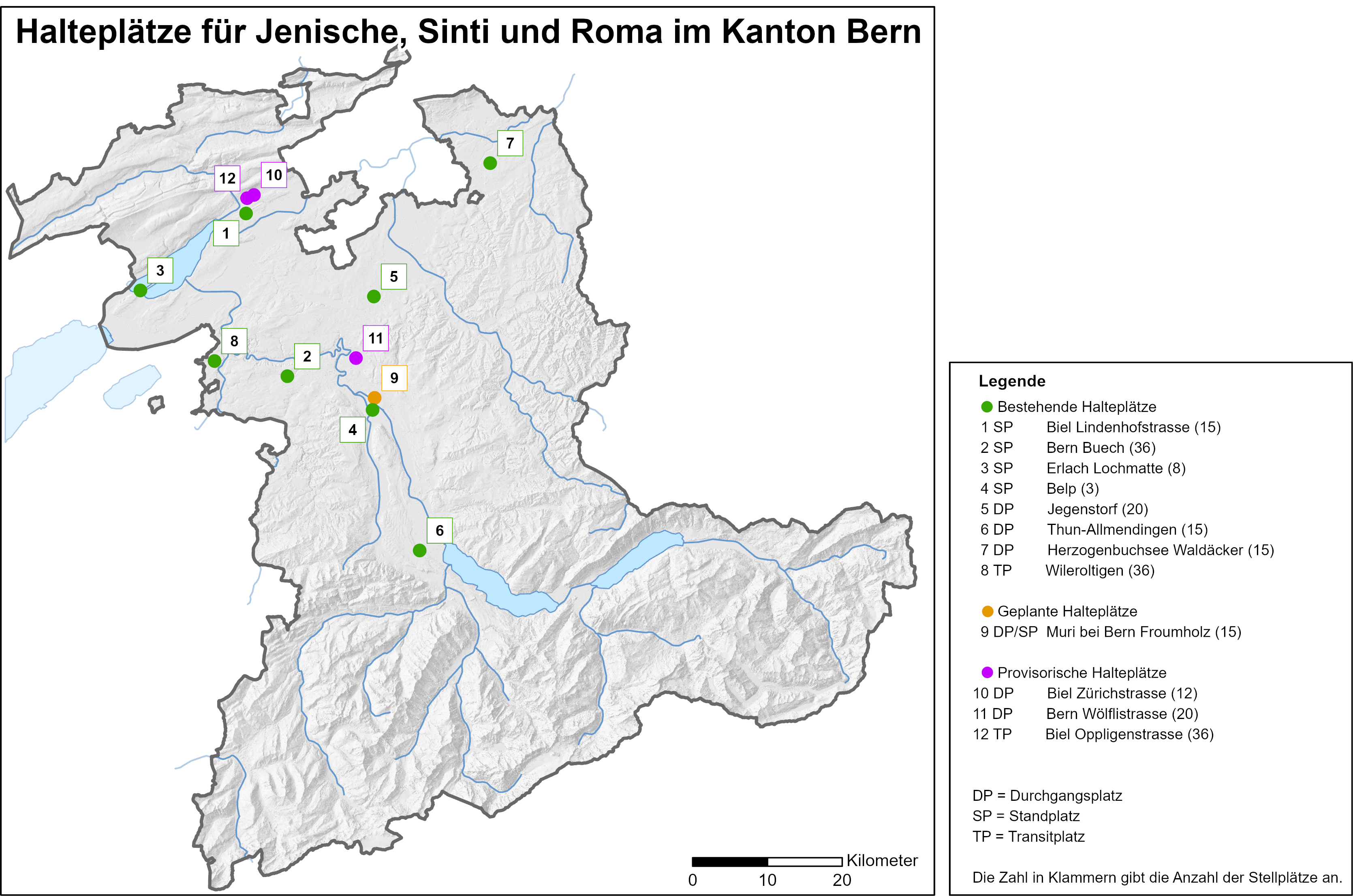 Der Kanton Bern verfügt bereits über mehrere offizielle Halteplätze. Zudem plant und realisiert er in Zusammenarbeit mit den betroffenen Regionen und Gemeinden zusätzliche Stand-, Durchgangs- und Transitplätze. Damit will er nicht nur gute Grundlagen für eine fahrende Lebensweise schaffen, sondern gleichzeitig auch unerwünschte Landnahmen reduzieren, welche häufig die Folge eines Mangels an offiziellen Haltemöglichkeiten sind. Gleichzeitig ist der Spontanhalt als traditionelle Form der fahrenden Lebensweise aufgrund von allgemeiner Platzknappheit und gesetzlichen Restriktionen unter Druck geraten. Detaillierte Informationen zum Spontanhalt finden sich in den Merkblättern unter den Rubriken «Kantonale Hilfsmittel und Konzepte» sowie «Mehr zum Thema». Auch zum Thema der unerwünschten Landnahmen lassen sich dort Hilfsmittel finden. Auf der folgenden Karte sind die definitiven, provisorischen und geplanten Halteplätze für Jenische, Sinti und Roma im Kanton Bern ersichtlich. Unterhalb der Karte sind die Standortgemeinden sowie die für den Halteplatzbetrieb verantwortlichen Stellen zu finden.