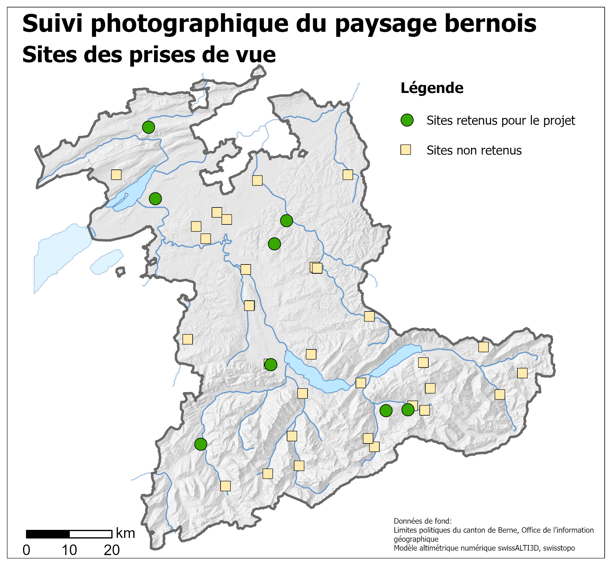 La documentation des changements intervenus revêt donc une importance particulière et constitue une base permettant de reconnaître les tendances et de tirer d’éventuelles conclusions. C’est dans ce but que le projet «suivi photographique du paysage bernois», qui s’inscrit dans le cadre de l’observation du territoire, a été lancé en 2005. Les sites ont été sélectionnés en fonction de critères thématiques ainsi qu’en raison de l’existence de photographies anciennes. Le canton de Berne dispose d’une base de données comprenant des photos prises sur quelque 35 sites se prêtant à un suivi photographique. En 2015, environ 20 sites ont fait l’objet d’une nouvelle prise de vue.